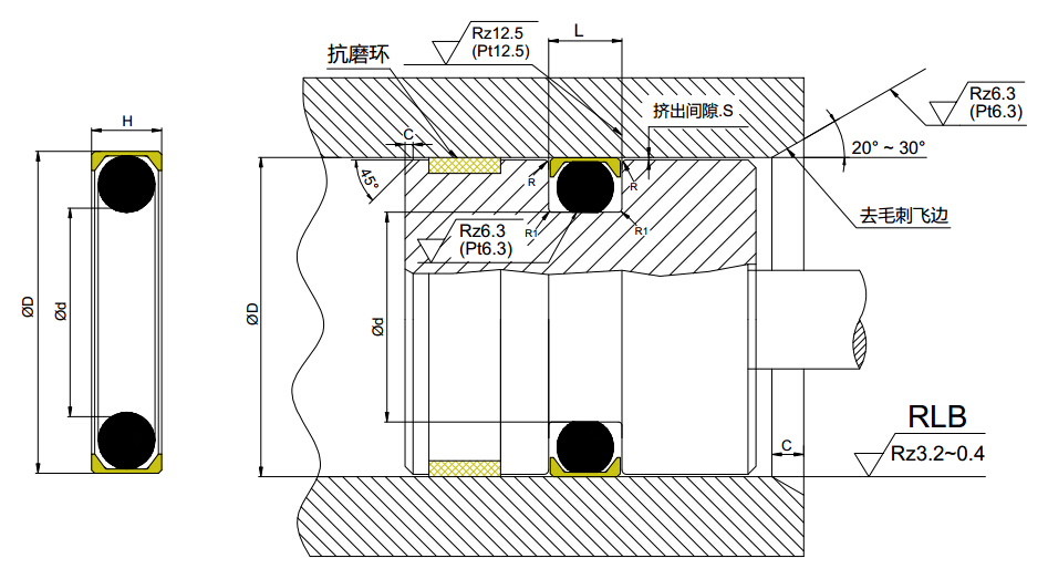 由一彈性體O形圈施力的雙作用密封元件??裳b在現(xiàn)有的O形圈溝槽中,