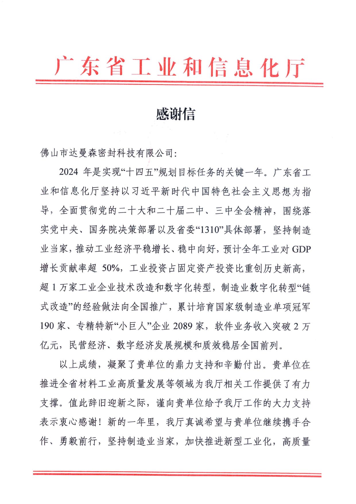 值此辭舊迎新之際,廣東省工業(yè)新材料協(xié)會(huì) 、佛山市達(dá)曼森密封科技有限公司等13家單位收到了廣東省工業(yè)和信息化廳發(fā)來的感謝信,信中對(duì)以上單位為廣東省工業(yè)經(jīng)濟(jì)發(fā)展做出的貢獻(xiàn)表示衷心感謝。