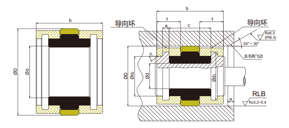 由密封環(huán)、彈性圈和二個導(dǎo)向套組成,導(dǎo)向套起定位和導(dǎo)向作用,彈性圈提供預(yù)緊力并補(bǔ)償密封環(huán)的磨損,密封環(huán)與油缸內(nèi)孔形成配合對偶面而產(chǎn)生密封效果,適用于油缸活塞的密封。DKDF具有雙向密封效果。